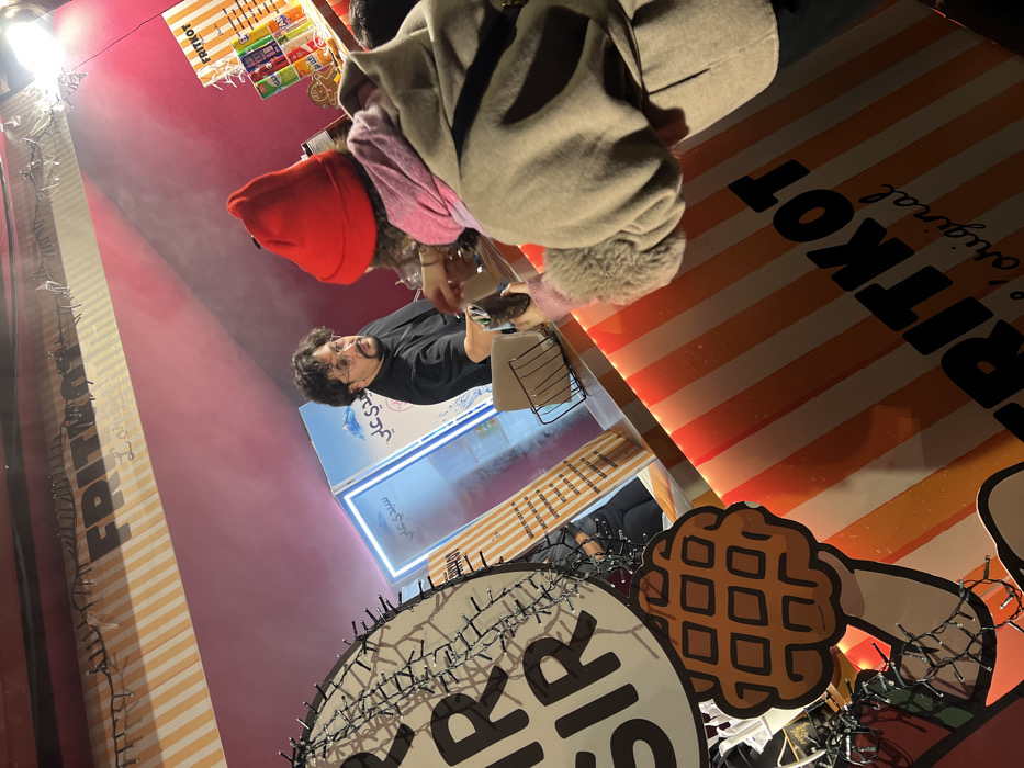 A man with a beard and glasses serves a customer at a food stand. He wears a black shirt. The customer has on a red hat and a tan coat. A sign says "FRITKOT". A drawing of a waffle is seen, as well as a large, round sign with string lights. The food stand has striped orange and white accents. The scene is brightly lit.