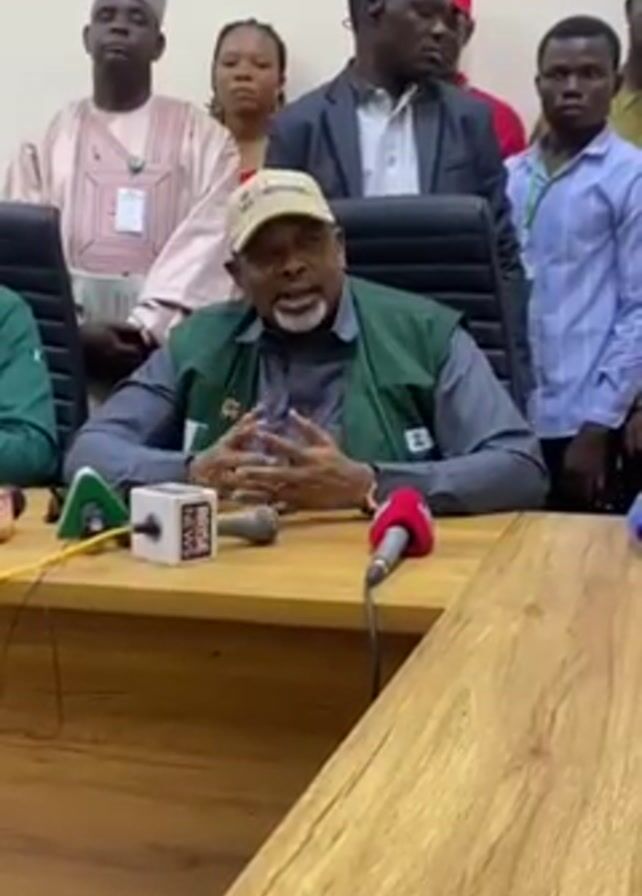 A man with a white beard is seated at a wooden table addressing a crowd. He is wearing a green vest over a gray shirt and a baseball cap. Two microphones are in front of him on the table. Several people stand behind him, and most of them are looking at the man speaking. The room appears to be a conference or office setting.