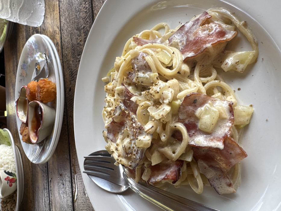 A plate of spaghetti carbonara dominates the frame, featuring creamy sauce, diced onions, bacon, and herbs. Silverware rests on the plate beside the pasta. A smaller, decorated plate holds fried balls and sauce containers. Part of another plate with rice and greens peeks into the left side of the picture. The background is a rustic wooden surface.