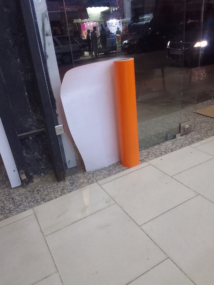 The image captures an interior view looking out through a glass storefront at nighttime in the city of Unknown, Unknown. The immediate foreground shows light-colored, rectangular floor tiles, transitioning to a speckled dark grey granite strip at the base of a transparent glass panel. Leaning against the glass is a large, partially unrolled white sheet material, with an exposed bright orange core on its right side. Faint numerical markings are visible on the white material. To the left of the glass, a dark, vertical metal frame or pillar is present. Through the glass, an urban street scene unfolds under artificial illumination. Several indistinct human figures, approximately 4-6 individuals, are visible on what appears to be a sidewalk across the street. A dark-colored sedan is partially visible on the left side of the street, and another dark-colored vehicle with its headlights illuminated is visible further down the street on the right. Storefronts across the street are illuminated with interior lights, displaying items and casting light onto the pavement. The overall environment is a streetscape during the night.