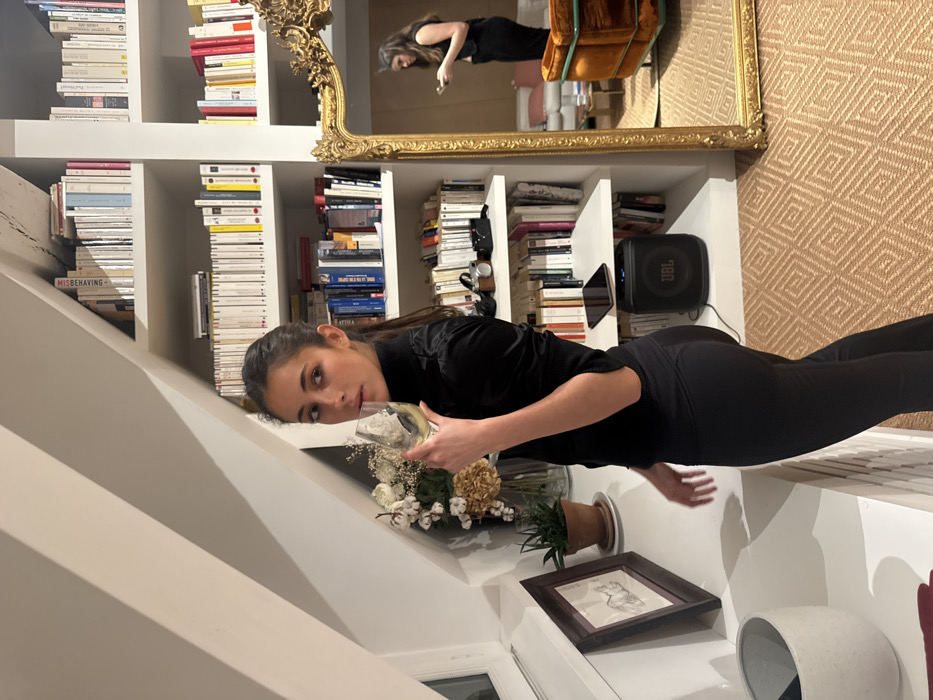 A woman in black stands in front of a bookshelf, holding a glass of white wine. She looks directly at the camera. On the shelf below is a flower arrangement, potted plant, and framed art. A large mirror above the bookshelf reflects another woman in a black dress, standing near an ornate chair. The room has a patterned carpet and a white wall with a sloping ceiling. A JBL speaker and tablet are also on the bookshelf.