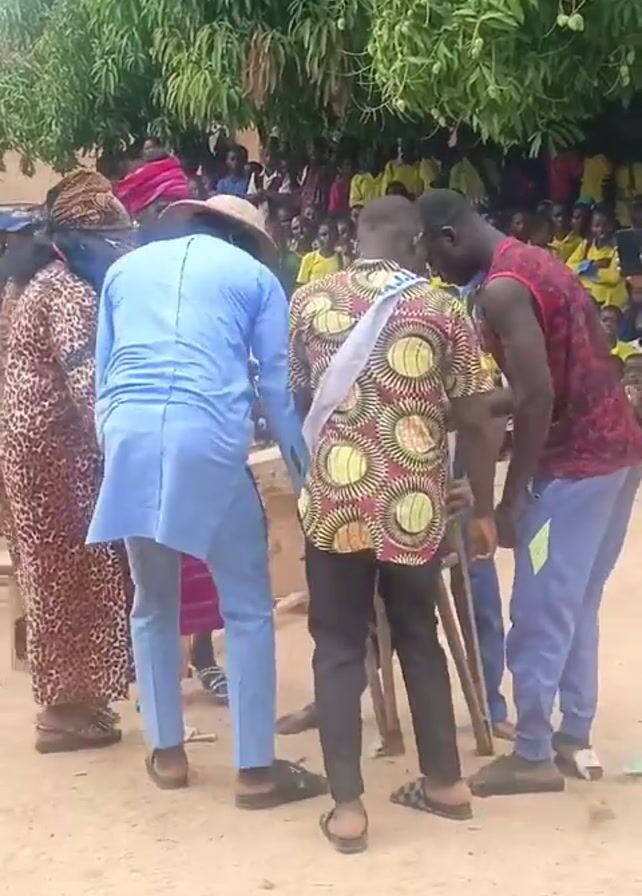 The video depicts a group of people gathered in an outdoor setting, with a crowd of children in yellow uniforms visible in the background. The group includes a person dressed in a blue outfit and a straw hat, another in a colorful patterned shirt, and someone wearing a red tank top. There is also a person in a white shirt on crutches being assisted by others. The ground is sandy, and trees are visible in the background. The people appear to be interacting and possibly performing some kind of ceremony or activity.