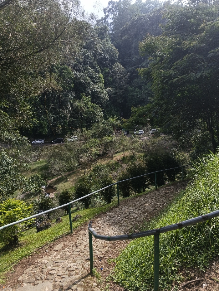 The image depicts an outdoor, downward-sloping scene within a vegetated area in Tamghas, Nepal, captured on a bright day. In the foreground, a stone-paved path descends towards the viewer's left, flanked by a green metal handrail with a silver top rail on both sides, with the right-side rail extending further into the frame. Green grass and scattered ground cover border the path. The midground reveals a sloped, terraced landscape with various green shrubs and trees. A small, dark pool of water is visible in the lower-left midground. Further back, a paved road traverses horizontally across the frame. On this road, at least five motor vehicles are present: a white van/SUV on the far left, a black sedan, a white van/SUV, and two more white vehicles partially obscured by foliage to the right. Several indistinct human figures are visible on or near the road, with no discernible actions or interactions. The background is dominated by a dense, steep hillside or mountain covered with lush, dark green foliage, indicating a heavily forested environment. The sky above is bright, suggesting daylight conditions.