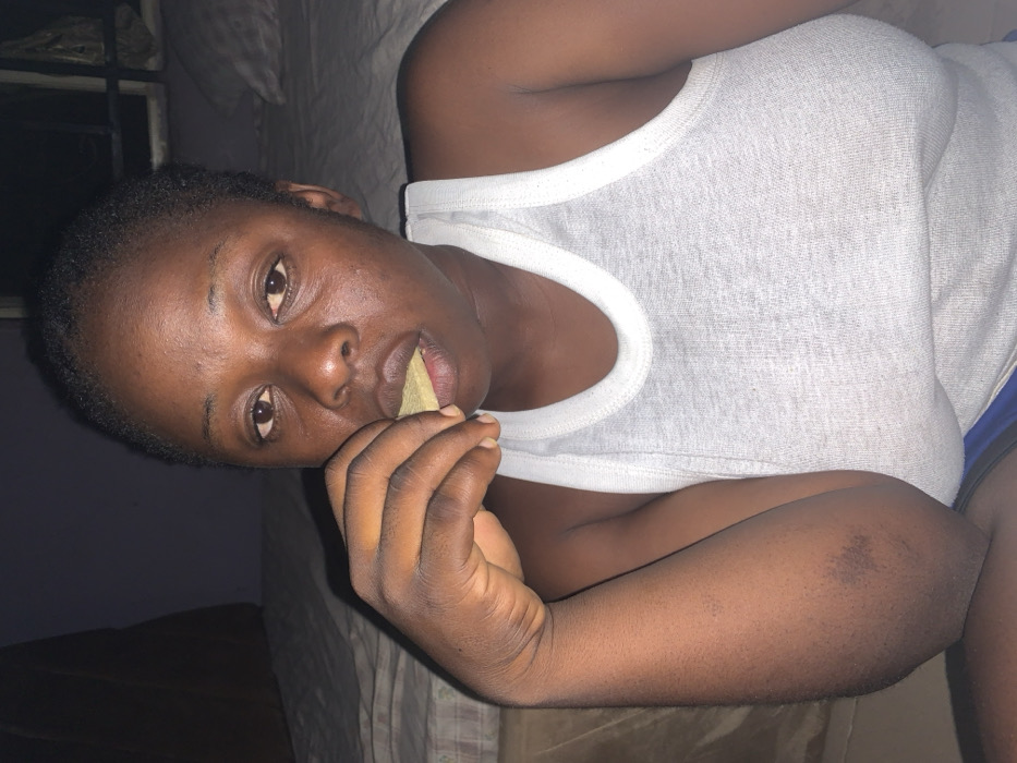 A medium close-up image depicts a single individual, an adult female with dark skin and short dark hair, facing directly forward. She is wearing a light-colored, ribbed tank top. Her right hand is raised, holding a light-colored, triangular food item partially inserted into her mouth. A faint, dark, approximately circular mark is visible on her right inner elbow. The background consists of a dimly lit indoor residential space, featuring a light-colored mattress or bedding on a bed frame to the left, and a dark wall behind the subject. The specific location within Akwanga, Nigeria, cannot be determined from the visual information provided.