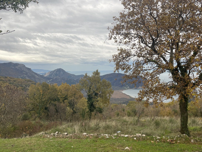 The scene depicts an expansive panoramic landscape captured in Novoselje, Montenegro, under a heavily overcast sky dominated by layers of grey clouds. The foreground consists of a grassy slope transitioning to dry, lighter-colored vegetation, with scattered small white rocks and a reddish-brown debris fragment near the center. A prominent deciduous tree, likely an oak, with a thick, textured trunk partially covered in dark green ivy, stands on the right, its branches adorned with abundant dry, yellowish-brown autumn foliage. A white plastic object, possibly refuse, is visible on the ground near the base of this tree. The midground reveals a valley densely covered with a mix of deciduous and evergreen trees and shrubs, displaying a palette of greens, browns, and oranges indicative of autumn. Beyond this vegetation, a large crescent-shaped sandy or light-colored beach curves along the coastline of a significant body of water, identified as the sea. A large, dark green vegetated hill or mountain forms the immediate left boundary of the beach. In the background, multiple layers of rugged mountains with varying degrees of vegetation ascend into the distance, partially veiled by atmospheric haze, meeting the horizon where the sea and sky converge. No individuals, animals, or active events are present in the image.