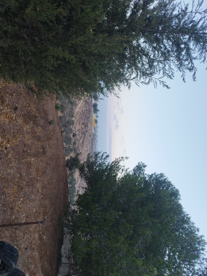 This image presents an elevated view overlooking a landscape in the vicinity of Al-Burj, Palestinian Territory, captured during either early morning or late afternoon conditions. The immediate foreground features a dry, reddish-brown earth slope with sparse, dried vegetation. In the lower-left corner, two dark, circular objects, likely discarded tires, are partially visible. A slender, dark-colored pole or stake is vertically embedded in the ground, positioned slightly to the left of the frame's center. Dense green foliage from large trees partially frames the view, with significant portions of branches and leaves obscuring the upper-left and lower-right quadrants of the original vertically oriented image (which corresponds to the left and right sides if viewed in standard landscape orientation). The midground reveals a valley or depression, with the reddish-brown slope descending and then rising on the opposite side. Scattered green trees and shrubs dot the hillsides. On the distant opposing landmass, indistinct structures are visible, including a prominent, large, light-yellow or beige building. Beyond these structures, the horizon line is faint, showing a lighter band of sky that could indicate a distant plain or a body of water. The background consists of a pale blue sky, lighter near the horizon, with several diffuse white clouds. No individuals are present in the observable scene. The environment is characterized by a dry, Mediterranean-type climate with hilly terrain and sparse to moderate vegetation, typical of rural areas in the Palestinian Territory.