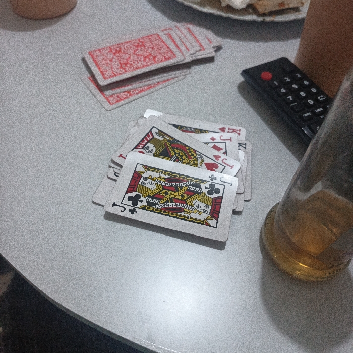 A pile of playing cards sits on a light gray, speckled table. The top card is the Jack of Clubs, followed by the King of Hearts, and several other obscured cards. A second stack of cards, face down with a red geometric pattern, is near the edge. A black remote control lies nearby. A glass containing a yellowish liquid, possibly beer, stands to the right, partially obscuring the scene.