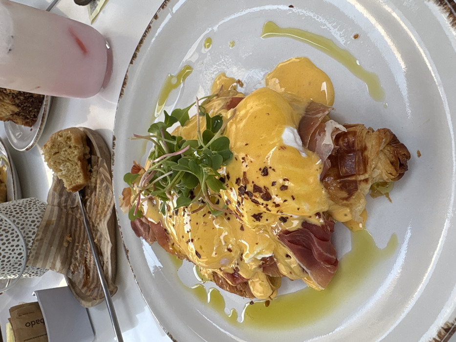 A plate features a Croffle Eggs Benedict with prosciutto, hollandaise sauce, microgreens, and pepper flakes