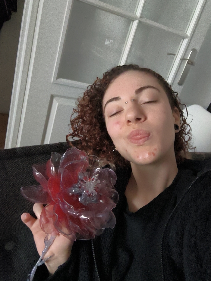 A forensic description of the scene reveals a light-skinned female, appearing to be a young adult, captured in a head-and-shoulders portrait within an indoor residential setting in Unknown, Unknown. The individual has curly reddish-brown hair, dark eyebrows, and a light complexion. Her eyes are closed, and her tongue is slightly extended in a "duck face" expression. She exhibits two dermal piercings above her nose bridge and earlobe gauges. Acne is visible on her right cheek and chin. She wears a black v-neck garment beneath a black zippered fleece jacket. In her left hand, positioned in the lower left, she holds a translucent, multi-layered craft object resembling a flower, predominantly red and clear plastic, consistent with repurposed materials. The background consists of a white interior door with multiple glass panes and a silver handle, alongside a dark upholstered furniture item partially visible on the left.