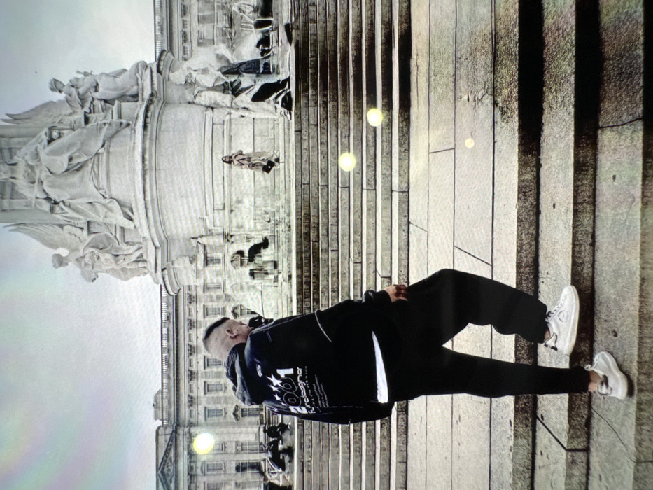 The image depicts a public outdoor scene located in the city of Kyustendil, Bulgaria. In the foreground, a male subject with a faded haircut, seen from the rear, is ascending a wide set of light-colored stone steps. He wears a black hooded sweatshirt featuring white text and star graphics, including "2001 Foreigner," dark trousers, and white athletic shoes with metallic accents on the heels. His left foot is planted on a lower step, while his right foot is poised slightly above, indicating movement. Behind the subject, a large, ornate multi-tiered stone monument dominates the middle ground. This monument features a central seated female statue, surrounded by various allegorical figures, winged statues, and additional sculptures at its base, all appearing to be light-colored stone. Further in the background, a grand, multi-story building with numerous windows, columns, and intricate architectural details is visible, extending horizontally across the frame. Several other individuals are present in the background on or around the monument's steps; one person in light-colored attire stands on a platform near the center of the monument. The sky above is overcast, and the paved ground leading to the steps is also light stone. Multiple circular, yellowish light artifacts, consistent with lens flares, are visible in the mid-ground and foreground of the image.