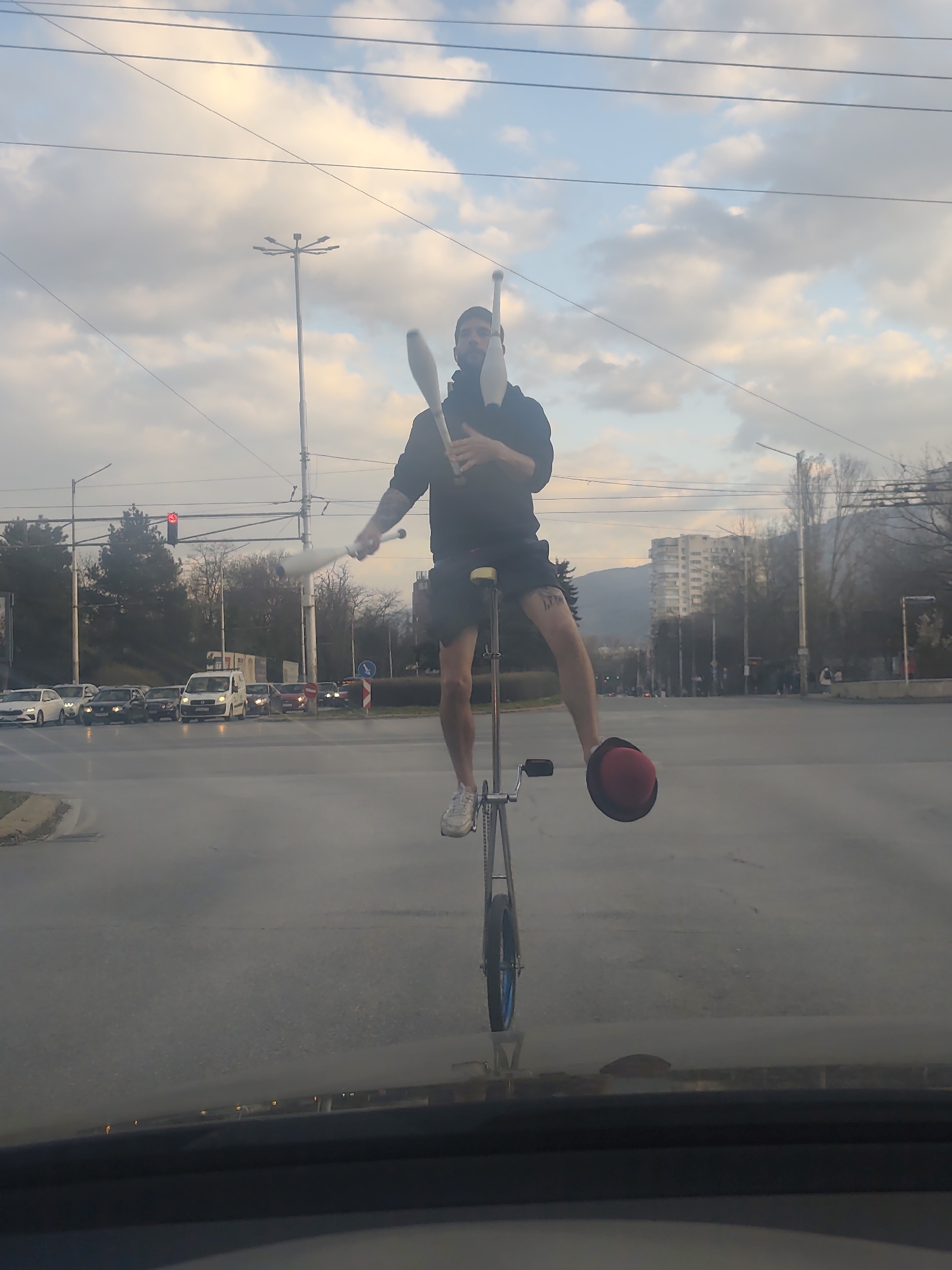 - "An adult male street performer is depicted balancing on a unicycle in the middle of a multi-lane intersection in Sofia, Bulgaria, with Vitosha Mountain visible in the background" by FM-0qfYB3, licensed under CC BY 4.0