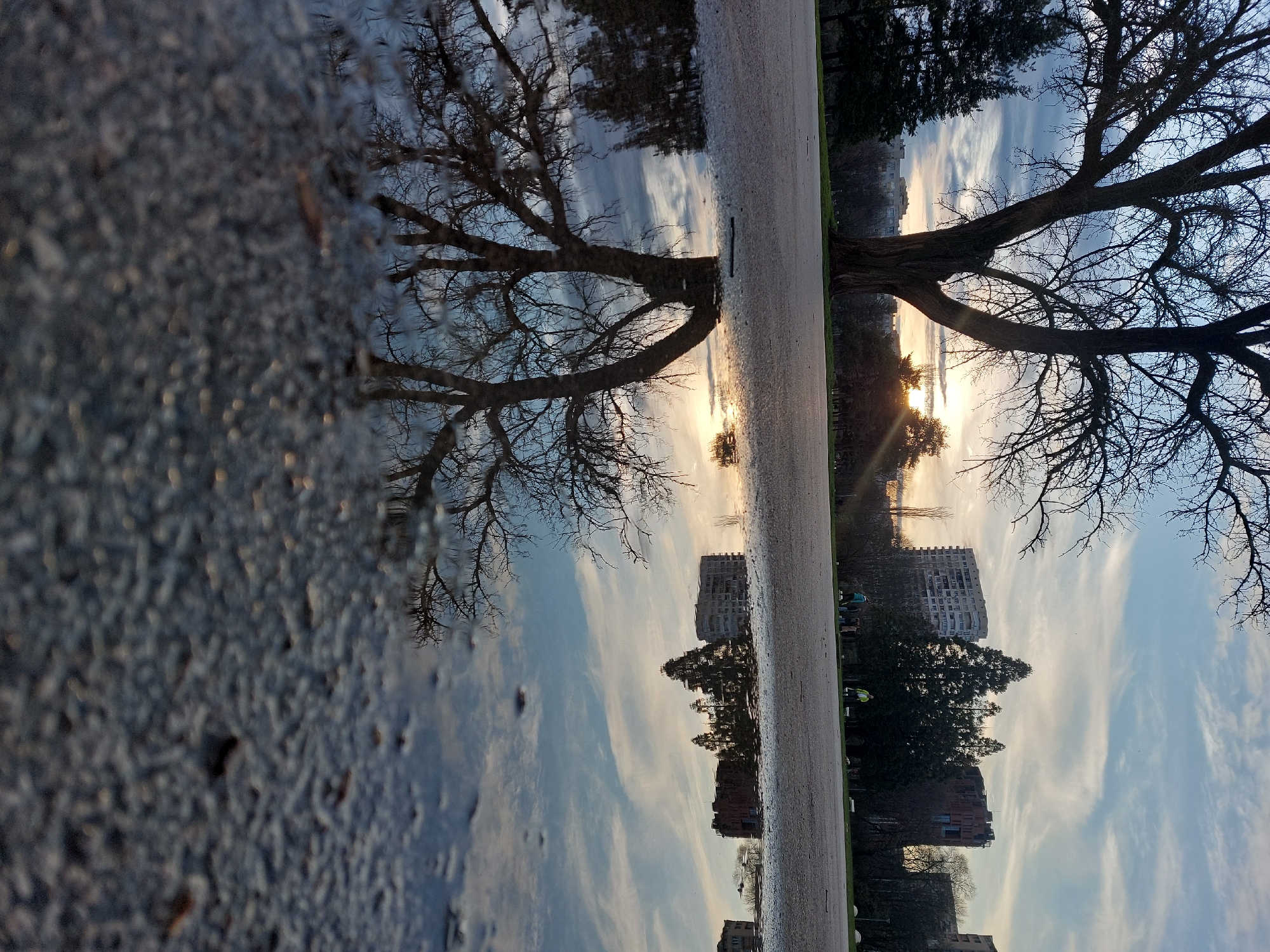 The image depicts a reflection in a puddle on a paved surface. The reflection features bare trees against a sky with wispy clouds. The setting sun is visible through the branches. A multi-story building is also reflected in the puddle. A park pathway runs along the edge of the puddle, separating it from a grassy area with trees. The image's location is Unknown, Unknown.