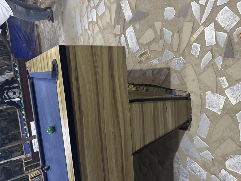 A partially visible pool table sits on a patterned tile floor. The table has a blue felt surface with a green ball. The side panel is a light brown, wood-grain laminate. Part of a person in grey pants and a white shirt is visible in the upper left. A rack of pool cues and balls is dimly lit in the background. Adjacent to the pool table, a shelf is built into the wall, mirroring the wood-grain pattern of the table.