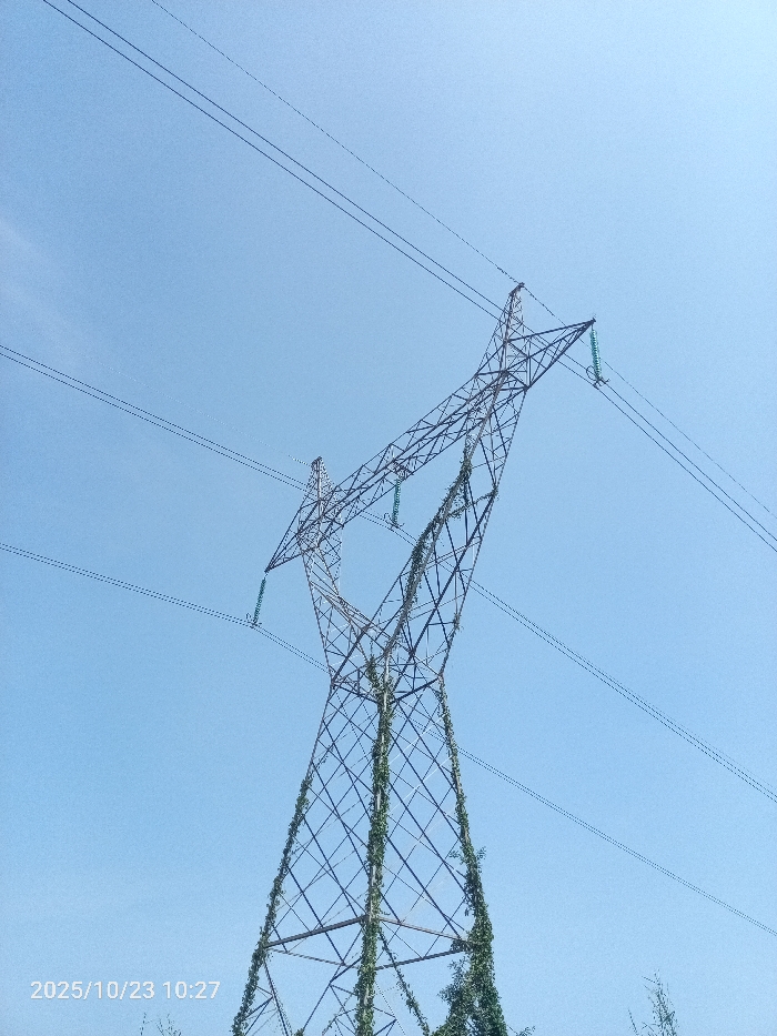 A tall, metallic lattice-work high-voltage electricity transmission tower dominates the frame, viewed from a low angle against a clear, bright blue sky. Green vegetation, identified as vines or creepers, extensively covers the lower and mid-sections of the tower's metallic structure. Multiple dark electrical transmission lines extend horizontally across the upper portion of the image, supported by the tower's cross-arms via pale green or turquoise-colored insulators. No individuals or discernible activities are present. The environment consists solely of the tower, power lines, vegetation, and the expansive blue sky. A digital timestamp "2025/10/23 10:27" is visible in the lower-left corner. The specific location within Enugu, Nigeria, is not discernible from the visual evidence.
