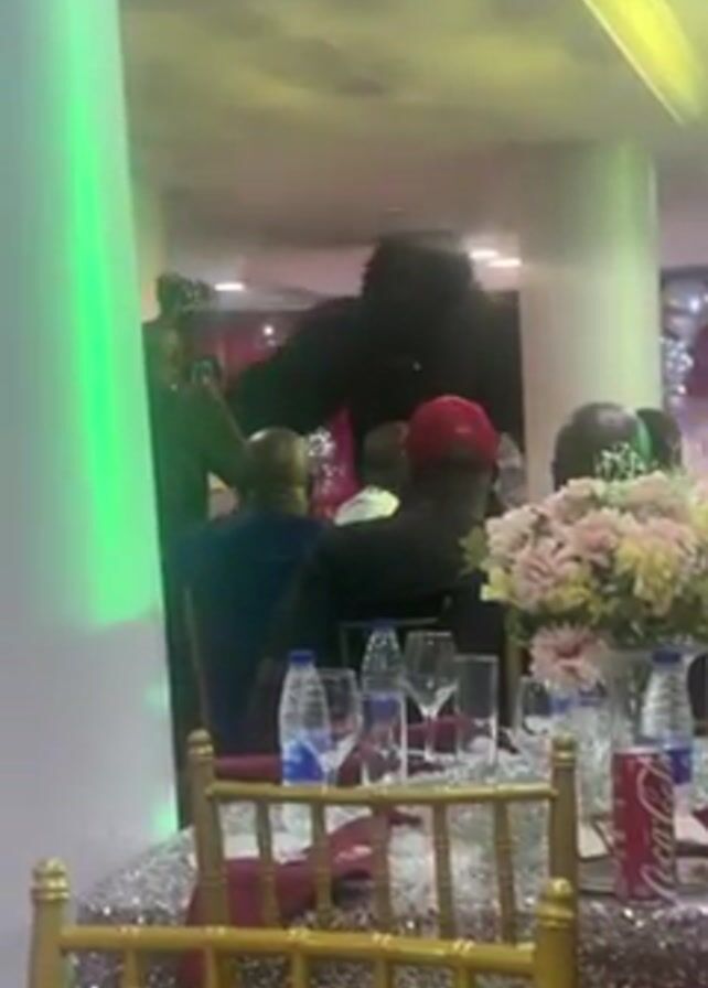 A man in a gorilla suit walks through a dining room filled with seated guests at tables. The dining area is decorated with a shimmery tablecloth, water bottles, wine glasses, Coca-Cola cans, and a vase of pink flowers. A photographer walks near the person in the gorilla suit, capturing the event. The room is illuminated with green, blue, and purple lighting.