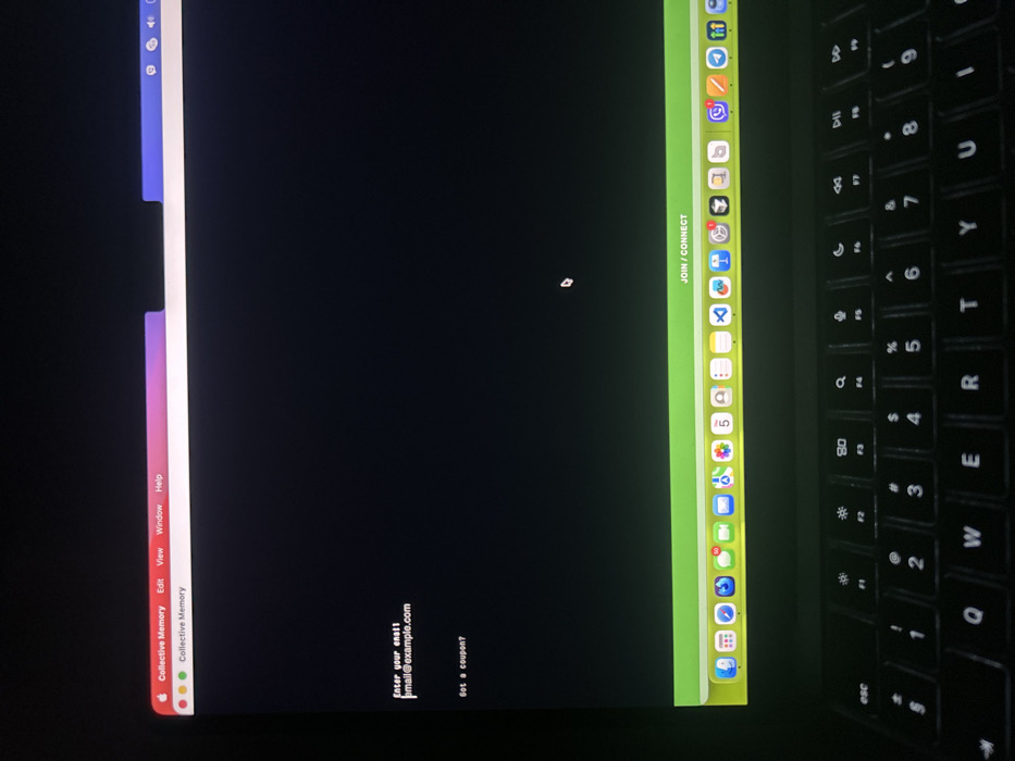 The scene depicts a close-up, slightly angled view of a MacBook laptop screen and the upper portion of its keyboard, observed in a dark environment in Voluyak, Bulgaria. The laptop screen displays an application window titled "Collective Memory" against a dark background. Within this application, text prompts read "Enter your email" followed by "jmail@example.com" and "Got a coupon?". A green horizontal bar at the bottom of the application window contains the text "JOIN / CONNECT." A white mouse cursor is visible on the dark screen background. Below the application window, the macOS Dock is visible, populated with various application icons, several of which display notification badges. The macOS menu bar is present at the top of the screen, showing "Collective Memory" as the active application alongside standard menu items and system status icons. The keyboard, partially visible, is backlit and shows keys from 'esc' to 'F6' and the QWERTY row from 'Q' to 'I'. No individuals are present in the image.