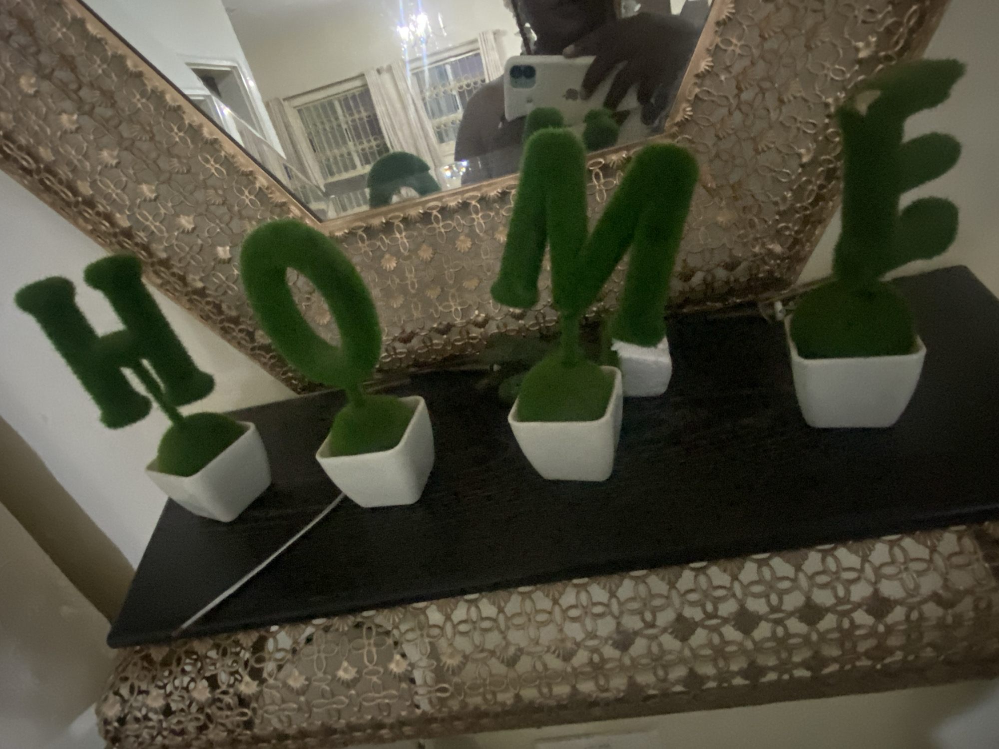 The image depicts a close-up view of the word "HOME" spelled out in green, fuzzy letters, each in a separate white pot. These are arranged on a black surface with an ornate, gold-colored frame or base beneath. The setting appears to be indoors, reflected in a mirror behind the "HOME" display, which includes a view of a window and a person holding a phone. The geographical location within the city of Barden Yana, Nigeria, cannot be determined from this image.