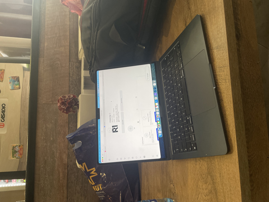 An indoor scene, consistent with a location in Svilengrad, Bulgaria, depicts a workspace without visible individuals. A dark gray Apple MacBook laptop is open and centered on a light brown wooden surface with a visible grain. The laptop screen displays an Instagram profile page for "r1vision.bg," showing "0 Posts, 2 followers, 1 following," along with options to "Edit profile," "View archive," "Share Media," and "Add phone number." The macOS Dock is visible at the bottom of the screen, populated with application icons. To the left of the laptop, a partially visible clear plastic water bottle with a blue cap rests next to a crumpled blue plastic shopping bag, which has some white text. To the right, a black bag, possibly a backpack, with a red zipper accent is partially visible. The background consists of a lower section with horizontal wooden planks in varying shades of brown and gray. Above this, a lighter-colored, possibly metal, surface is visible, bearing a red and white "CASADIO" sticker and two small rectangular magnets or pictures, one depicting two children and another a cartoon scene. A textured, dark red, spherical decorative object is situated on the background surface. The environment is illuminated, causing minor glare on the laptop screen.
