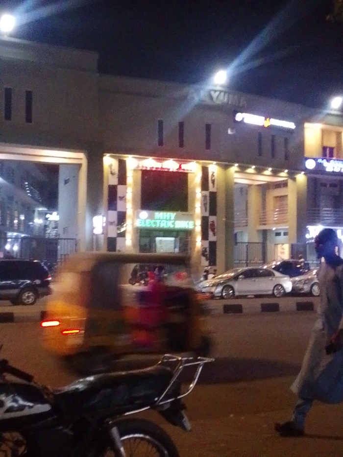 A nighttime street scene shows a building with illuminated signs including "MHY ELECTRIC BIKE" and "YUMA"