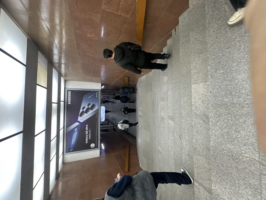 The image displays a downward-sloping metro station stairwell in Tashkent, Uzbekistan. The walls are clad in polished reddish-brown stone, and the ceiling features a grid of large, rectangular, illuminated light panels. Directly above the midpoint of the descent, a prominent, illuminated billboard advertises "SAMSUNG" with "Galaxy S23 Ultra" and "Galaxy AI" displayed. A light-colored handrail is visible along the right wall. The stairs are composed of light grey, speckled stone. In the foreground, on the top step to the left, a person in a grey puffer vest, dark long-sleeved shirt, dark pants, and light sneakers stands partially facing away from the camera. To the right, another individual in a dark hooded puffer jacket, dark pants, and dark shoes descends the stairs, carrying a black shoulder bag. Further down, several other people are visible on the stairs and on the landing at the bottom, moving in various directions, primarily dressed in dark winter attire.