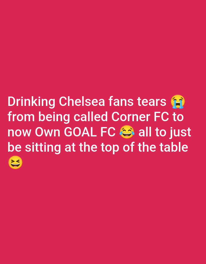 This digital graphic displays white text on a solid reddish-pink background. The text reads: "Drinking Chelsea fans tears 😭 from being called Corner FC to now Own GOAL FC 😂 all to just be sitting at the top of the table 😝". Three emojis are embedded within the text: a crying face (😭), a face laughing with tears (😂), and a winking face with a tongue out (😝). The content expresses a sports-related commentary or taunt concerning Chelsea Football Club fans and their team's perceived performance and league position. No physical environment, individuals, or tangible objects are depicted; the scene is entirely digital. This digital message is observed in a context attributed to the city of Umudioka, Nigeria.