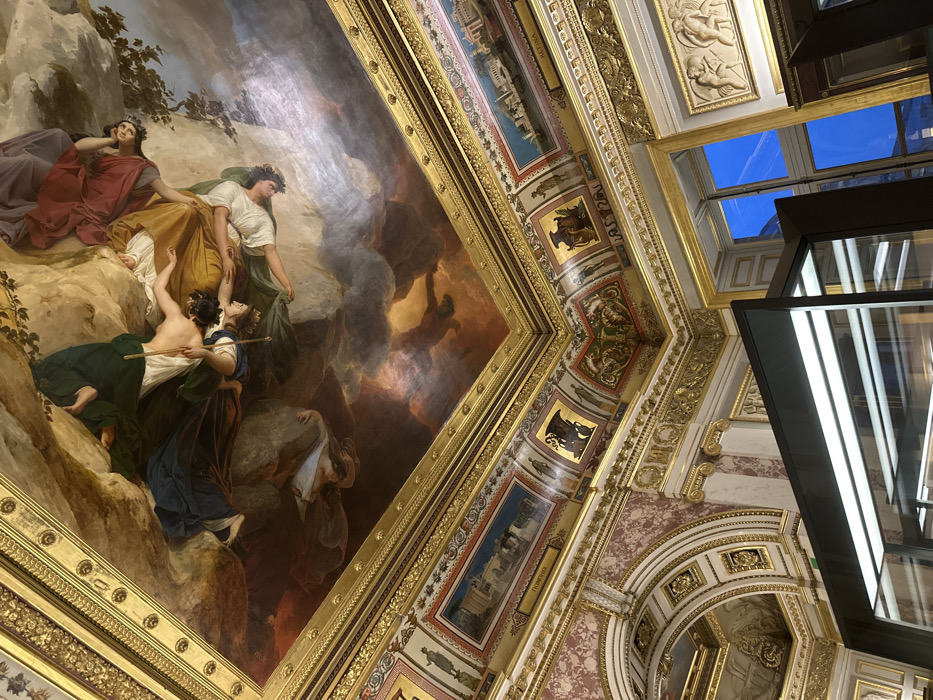 A ceiling mural framed in gold depicts women in classical garb set against a cloudy backdrop, one appears to be falling