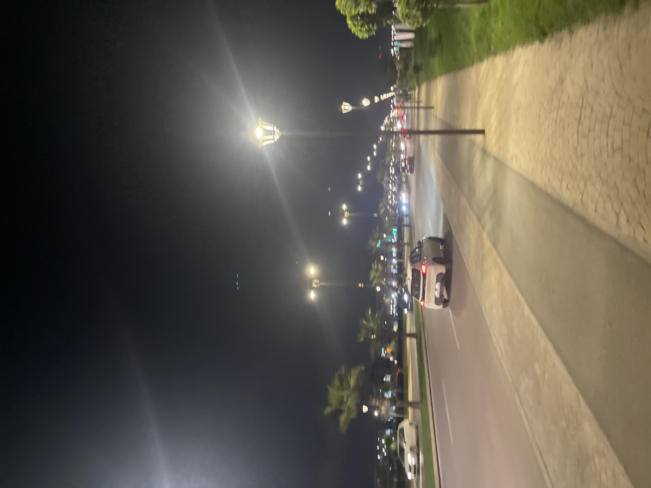 The image displays an urban street scene at night in Fez, Morocco. A multi-lane asphalt road, illuminated by numerous ornate streetlights, occupies the center and left of the frame. A white Peugeot 208 hatchback is visible in the rightmost lane, positioned in the mid-ground and traveling away from the camera. Its rear lights are illuminated. Additional vehicles, identified by their distinct white headlights and red taillights, are present in the distance on both sides of the road, indicating ongoing traffic. A wide, light-colored paver-stone sidewalk, featuring a visible herringbone pattern, is located on the right side of the image, extending from the foreground into the mid-ground. This sidewalk is bordered by a narrow strip of green grass and several dark, slender lampposts that cast elongated shadows to the left. A median strip, containing palm trees and further street lighting, separates the visible lanes from opposing traffic, which is partially obscured in the background. The sky overhead is dark and clear, showing no celestial bodies. No pedestrians or individuals are visible within the depicted area.