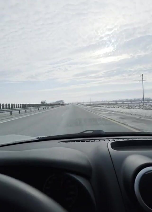 point-of-view shot from inside a vehicle driving on a highway. The sky is overcast with textured clouds. The road ahead appears wet, and the roadside is lightly covered in frost or snow. Guardrails line the left side of the road, and fields stretch out on either side. A few other vehicles can be seen in the distance on the highway. The vehicle's dashboard is visible, including the steering wheel and parts of the instrument panel. The general environment suggests a cold, possibly winter, day.