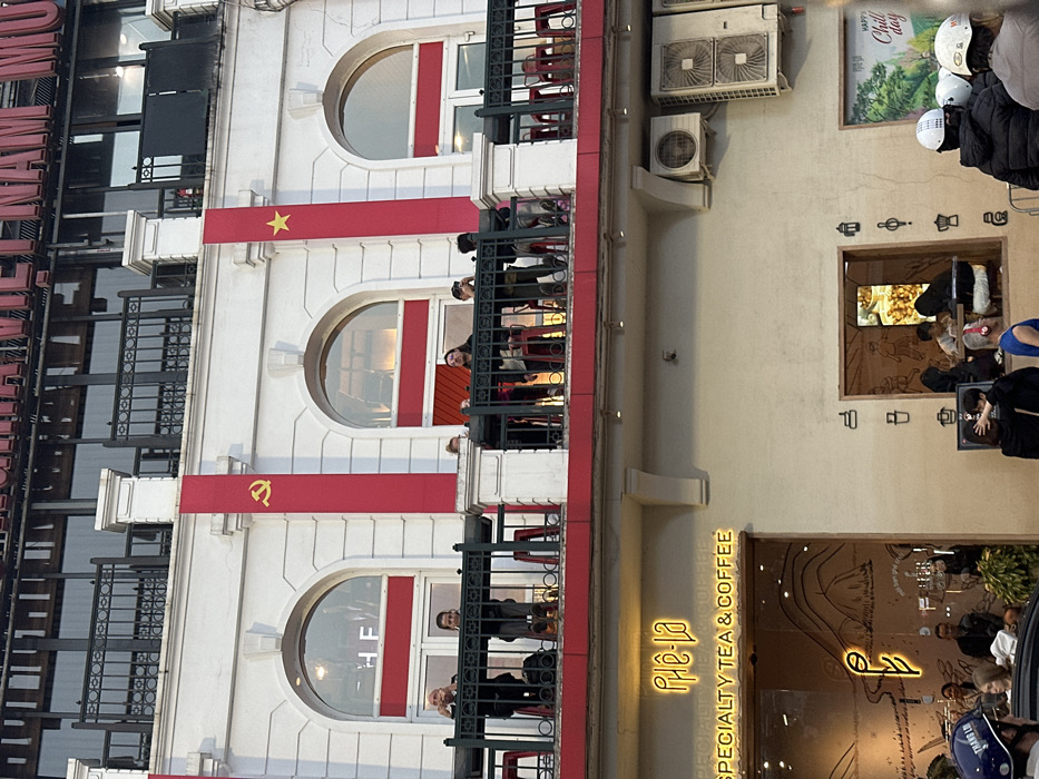 This image depicts a multi-story building in Hà Nội, Vietnam. The building features a white facade with classical architectural elements, including arched windows and balconies. On the second floor, a balcony with a black metal railing extends across the width of the building. Two vertical red banners are affixed to the facade, separating the arched windows; the left banner displays a gold hammer and sickle, and the right banner features a gold five-pointed star. Approximately seven individuals are present on this balcony, standing or leaning on the railing, some observing the street below. Red stools are visible behind them. Above this, the top visible level of the building has dark windows and a sign partially reading "HÀ NỘI VIỆT NAM". The ground floor houses a commercial establishment identified by a prominent neon sign as "Phê La - Specialty Tea & Coffee". Large glass windows reveal the interior, where several customers are seated. To the right of the main entrance, a recessed windowed area also shows customers seated at a table. Two external air conditioning units are mounted on the wall above this section. In the foreground, at street level, several people are visible. Multiple individuals are wearing motorcycle helmets, and one person in a blue shirt with red headphones is partially seen. An individual's hand is positioned on the head of another person wearing a dark top, suggesting an interaction.