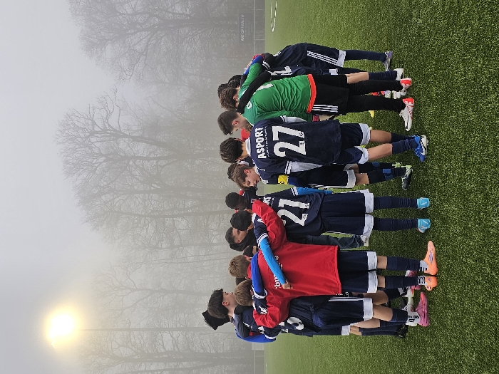A youth soccer team huddles together on an artificial turf field. They wear matching navy shorts and jerseys, some with numbers like 21 and 27 visible on their backs. A goalie wears a green jersey. The huddle stands out against a foggy backdrop, with bare trees visible in the distance. A bright light source illuminates the fog from the left, possibly a streetlamp.
