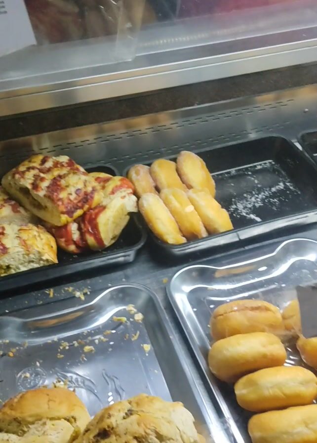 Inside a glass display case, various baked goods are arranged on silver trays. Doughnuts are visible in multiple trays. One tray contains buns labeled "Chicken Bun". There's also a tray with a pizza-like bread item. A person's arm reaches into the frame to photograph the items with a smartphone. The environment appears to be a bakery or cafe setting.