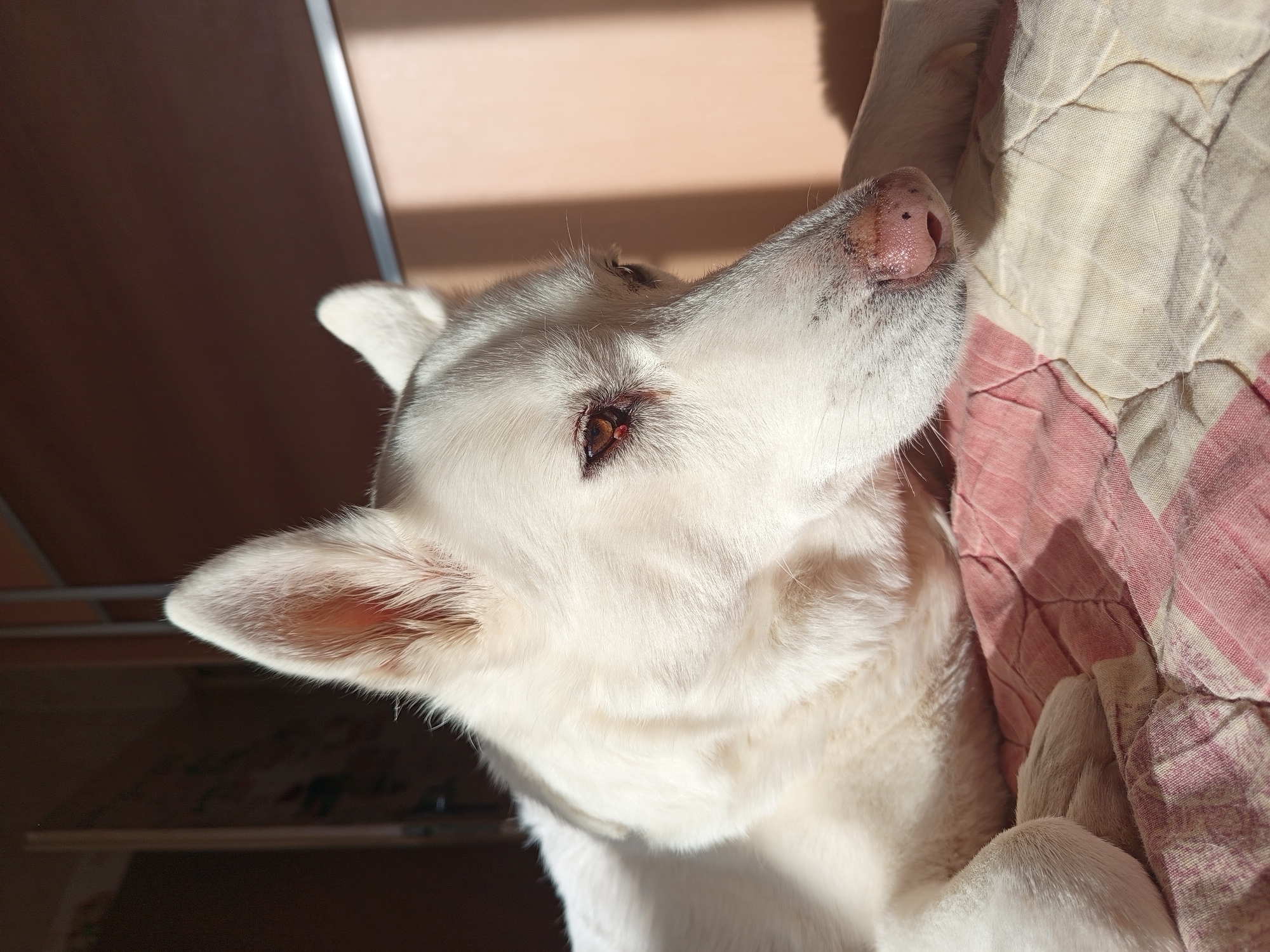 A white-furred dog, likely a husky or similar breed, is depicted lying down indoors in Svishtov, Bulgaria. The dog is positioned with its head slightly raised, looking towards the right of the frame. Its fur is uniformly white, and it possesses erect, pointed ears, one of which is fully visible. The dog's visible left eye (viewer's right) is brown, exhibiting a reddish discoloration or staining around the inner canthus. Its pink nose is dotted with small dark spots. The dog rests on a quilted textile surface, predominantly patterned in shades of pink and cream or light yellow. Strong, directional sunlight illuminates the dog's right side, creating distinct shadows on the bedding and against the background. The out-of-focus background reveals an interior space with a dark brown or wooden element on the left and a lighter, peach-toned wall or surface on the right, marked by vertical shadow lines. A thin, horizontal light-colored bar is visible in the upper right background.