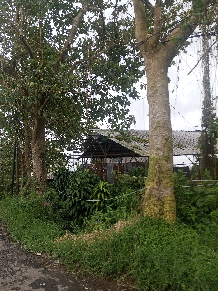 The scene depicts a roadside environment in Irupalai, Sri Lanka. A dark, cracked asphalt road occupies the lower left quadrant. Immediately adjacent to the road, a dense growth of green grass and weeds extends into the mid-ground. Multiple large trees with light-colored bark and leafy green canopies are positioned along the left side. A thick tree trunk, displaying patches of green moss and lichen, stands prominently in the mid-right, with a taut, light-colored wire secured around it. In the background, partially obscured by dense dark green tropical foliage, is a structure featuring a weathered, grey corrugated metal roof exhibiting moss growth. Supporting trusses are visible beneath the roof, and the structure's walls appear to be constructed from rusted corrugated metal panels. Dark utility lines are observed spanning horizontally across the upper mid-ground. No human figures, animals, or active interactions are present.