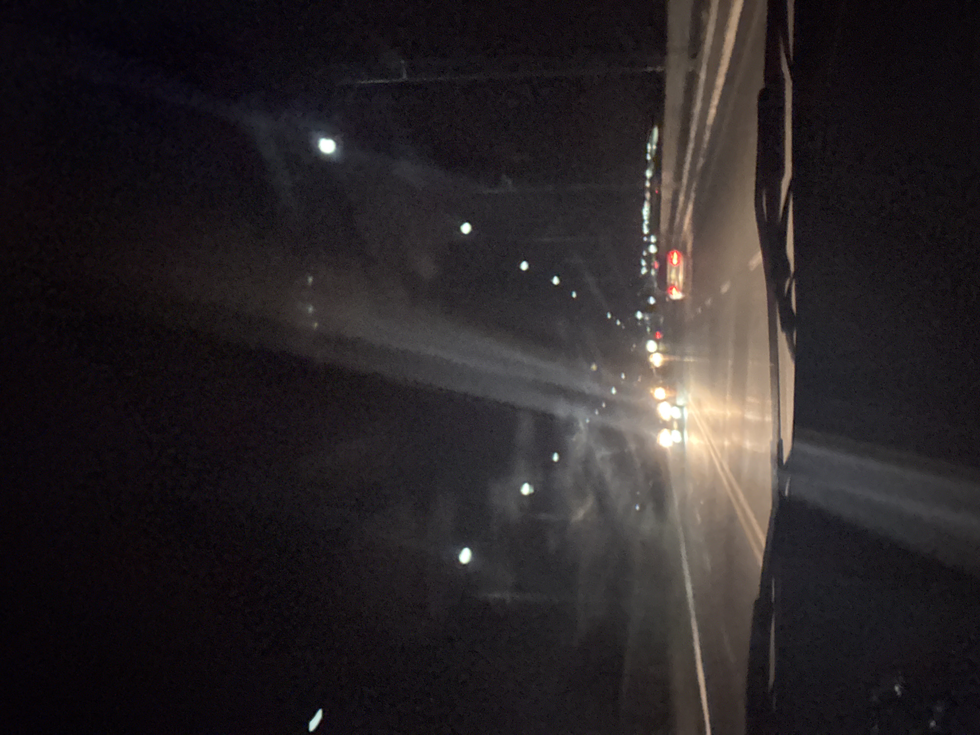 This image presents a nighttime scene observed from the interior of a vehicle traveling on a multi-lane road in Davao City, Philippines. The foreground shows the top edge of a dashboard and the bases of two windshield wipers, indicating the perspective is through the front windshield. Ahead, the road is illuminated by a series of overhead white streetlights, some of which exhibit lens flare or glare effects on the windshield, particularly a prominent vertical streak centrally located. Numerous vehicles are visible in the distance, identified by their illuminated white or yellow headlights and red taillights, suggesting ongoing traffic flow. The asphalt road surface reflects the vehicle lights, showing visible lane markings as white lines. The sky above is dark, with minimal discernible features beyond the artificial light sources and atmospheric effects or windshield smudges.