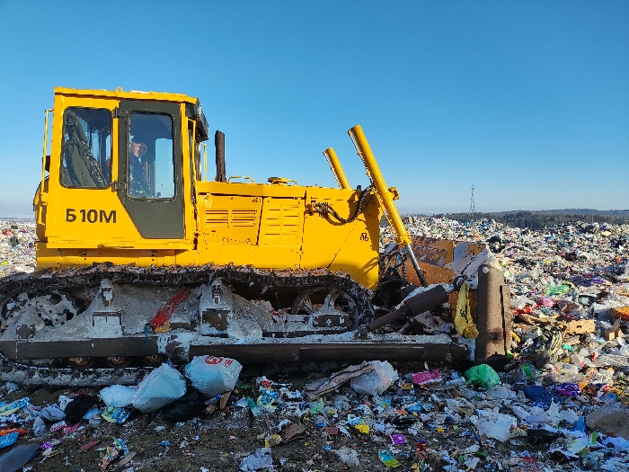 This image depicts a yellow Б10М tracked bulldozer operating at a landfill in the city of Svetlyi, Russia, under a clear blue sky