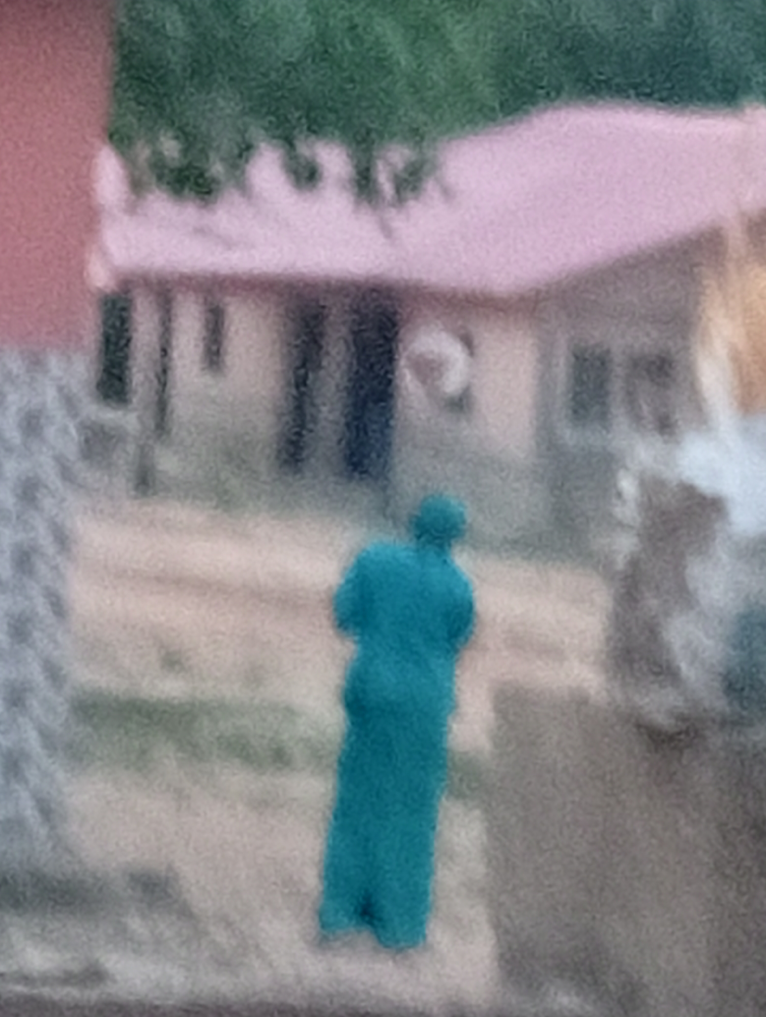 - "A blurred image shows a person in a blue garment standing in front of a building with a pink roof" by FM-EEWgo2, licensed under CC BY 4.0
