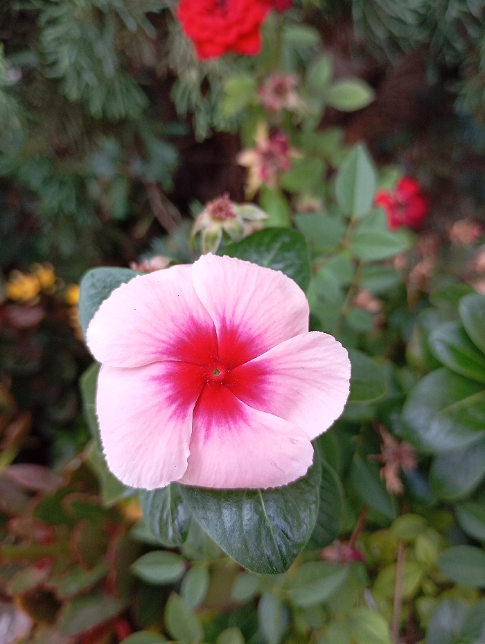 A close-up captures a vibrant pink and red flower in focus, surrounded by lush green foliage. The flower petals are a delicate pink, with a striking red center. Behind it, blurred greenery creates a soft background. Hints of red roses are visible in the distance. The overall composition emphasizes the flower's beauty within its natural setting.