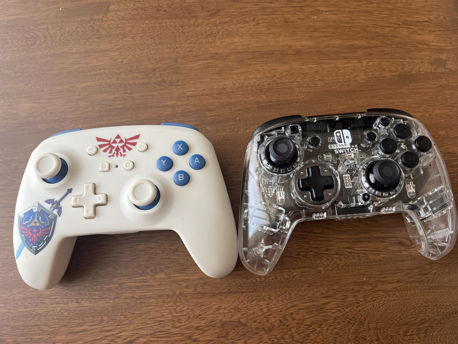 The scene depicts two video game controllers positioned on a light brown wooden surface