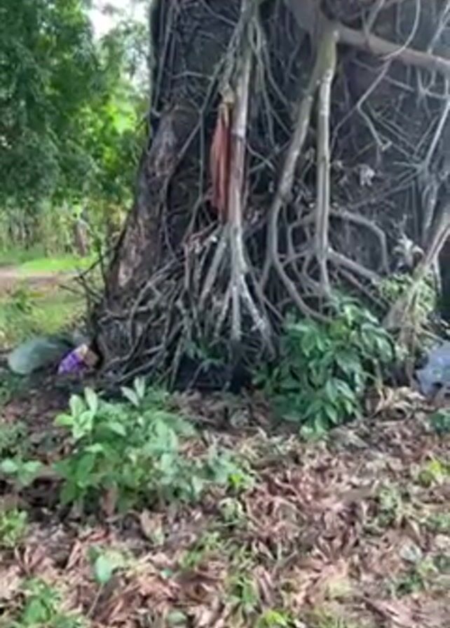 base of a large tree in a lush, green environment. The tree is notable for its extensive network of aerial roots that cover much of its trunk. The roots are thick and branch out, creating a dense, intertwined pattern. At the base of the tree, there is a mix of smaller plants and fallen leaves. Scattered trash and discarded items can be seen amongst the foliage, indicating some level of human activity or neglect in the area. A piece of cloth hangs from the tree trunk. The video pans slightly, showing more of the surrounding vegetation, including other trees and shrubs. The overall impression is one of a natural setting that has been somewhat affected by human presence.