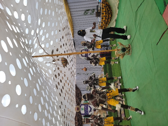 An event is underway within a covered venue in Jos, Nigeria. The ceiling is a white canopy perforated with numerous circular cutouts, allowing light to pass through. The floor is covered with green artificial turf. The background consists of light-colored draped fabric, accented with a yellow fabric valance and artificial green vines. A banner displaying "SPORTS AND CULTURE" and a blue and white crest are visible on the left background. Six individuals are present. Five men, positioned centrally and to the left, are dressed in yellow shorts, elaborate beaded chest harnesses, beaded ankle wraps with white feather-like embellishments, and black sneakers. The foremost individual is depicted airborne, mid-jump. Several performers hold small, dark, gourd-like objects near their chests. On the far right, a sixth man stands, wearing a white t-shirt, black pants, white sneakers, and sunglasses. He holds a black microphone in his left hand, facing towards the performers. A tall, light-colored wooden pole stands centrally, featuring a woven basket suspended near its top and a decorative woven base containing green foliage at its bottom. A round table draped in patterned yellow and brown fabric is located on the far right, displaying several brown objects. Additional small, brown, gourd-like props are scattered on the green flooring.