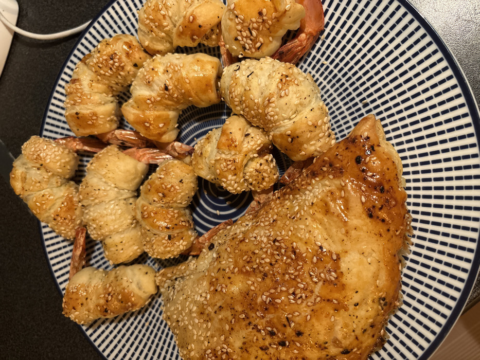 A patterned blue and white plate is filled with cooked food. There are several puff pastry-wrapped shrimp, sprinkled with sesame seeds. Next to the shrimp is a larger, shiny piece of baked poultry, also covered with sesame seeds. The plate's pattern is a repeating design of horizontal and vertical lines. The food appears golden brown and savory.
