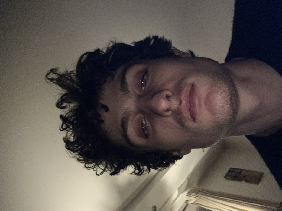 A low-angle, close-up indoor photograph depicts a male subject from the chest up, centered in the frame. The individual has dark, curly hair, light-colored eyes, a straight nose, full lips, and exhibits short stubble on the chin and jawline. He is wearing a dark-colored garment. The subject is looking directly at the camera. Overhead, a light-colored ceiling with a visible recessed light fixture is present. To the left, a window covered by light-toned, vertically striped curtains is visible. Below the window, a wall displays a small, dark-framed rectangular image or artwork. The background wall is a neutral, light color. The scene takes place in a room within the city of Vincennes, France.