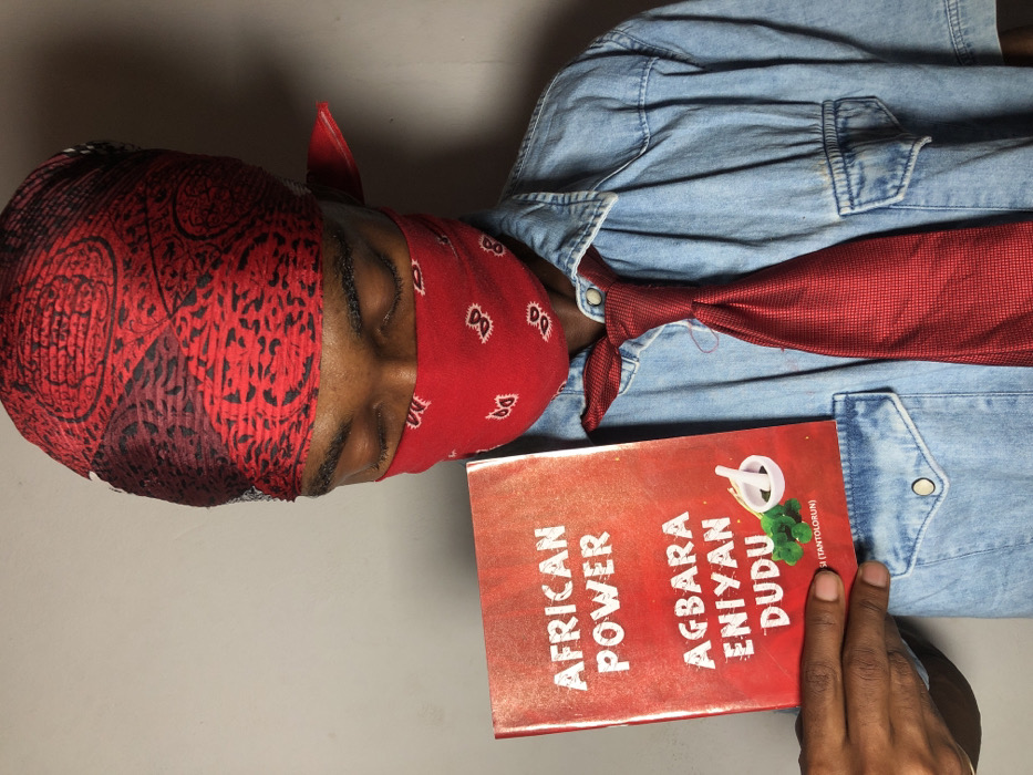 In Ngleshi Amanfro, Ghana, a dark-skinned individual is depicted from the upper torso against a plain, light gray background. The subject wears a red patterned head wrap covering their hair and a red bandana covering their nose and mouth. Their eyes are closed or directed downwards. They are dressed in a light blue, short-sleeved denim shirt featuring two chest pockets secured with metallic snap buttons. A red necktie with a subtle grid pattern is loosely tied around their neck. The individual's left hand holds a red book titled "AFRICAN POWER AGBARA ENIYAN DUDU" with white lettering. The book cover also displays an illustration of a white mortar and pestle containing green foliage, and partially visible text "(TANTOLORUN)".