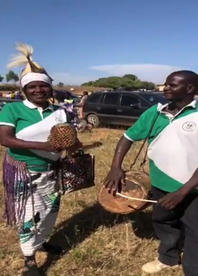 two people standing outdoors in a grassy field, both wearing matching green and white shirts. The woman on the left is also wearing a headdress with white feathers, a patterned skirt with purple tassels, and carrying a bag and a small, round, textured instrument. She is smiling at the camera. The man on the right is playing a small drum with a wooden stick. There are cars parked in the background and a few people walking around. The sky is blue and clear. The video appears to be shot handheld.