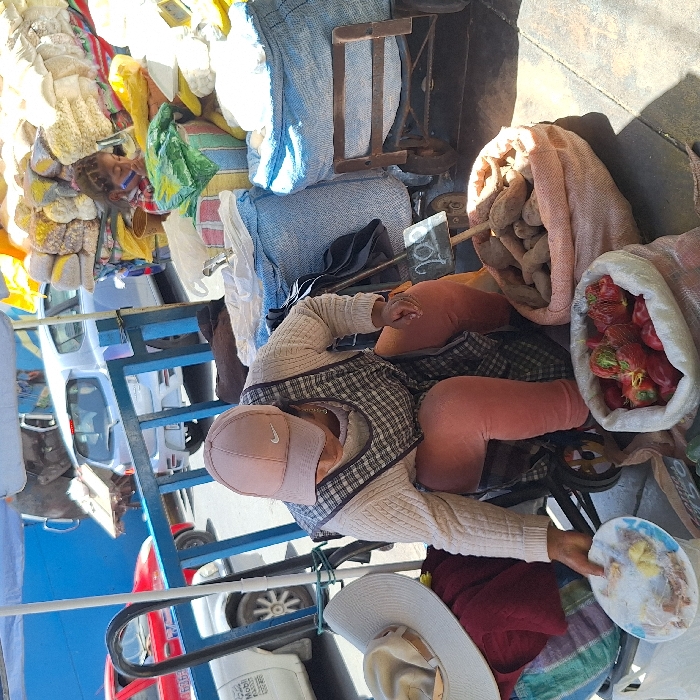 - "A woman in a pink cap and plaid apron sits amidst bags of produce, including potatoes and red peppers, on a platform, possibly a cart" by FM-b0Aw43, licensed under CC BY 4.0
