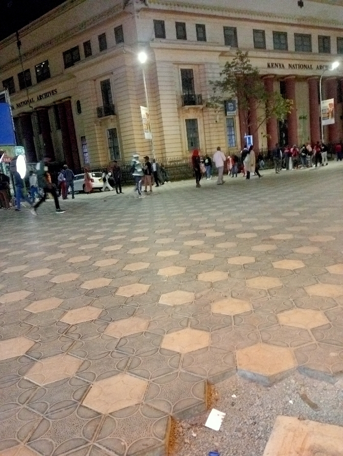 The image depicts an urban scene at night in front of the Kenya National Archives building in Nairobi, Kenya. The multi-story building, located in the background, features a light-colored facade, numerous rectangular windows, and a prominent entrance section with reddish-brown columns. The words "KENYA NATIONAL ARCHIVES" are legible on the upper facade above the columns. In the foreground, a patterned pavement covers the ground, consisting of interlocking hexagonal tiles. These tiles alternate between a light beige color and a dark grey color, with the grey tiles featuring an embossed quatrefoil design. Towards the bottom right, the patterned pavement ends, revealing a patch of loose gravel and dirt with scattered debris, including at least one piece of white paper. Approximately two dozen individuals are visible across the midground, primarily congregated near the building's facade and along the street. Most are standing or walking; one person in the left foreground is captured in mid-stride, demonstrating motion blur. A few vehicles, including a white car, are present on the street behind the pedestrians. Artificial light sources, including a prominent street light to the left of the building, illuminate the scene, casting ambient light on the building and the street. A small tree stands in front of the building.