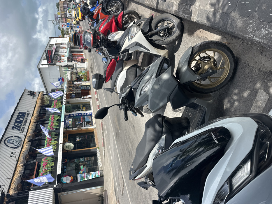 A row of motorcycles lines the edge of a street with commercial buildings. Shops with glass fronts are visible, some adorned with Greek flags and flowers. A building marked "Zorba" features a thatched roof and signage. The street appears paved and well-maintained. The sky is cloudy. A Honda logo is visible on one of the motorcycles.