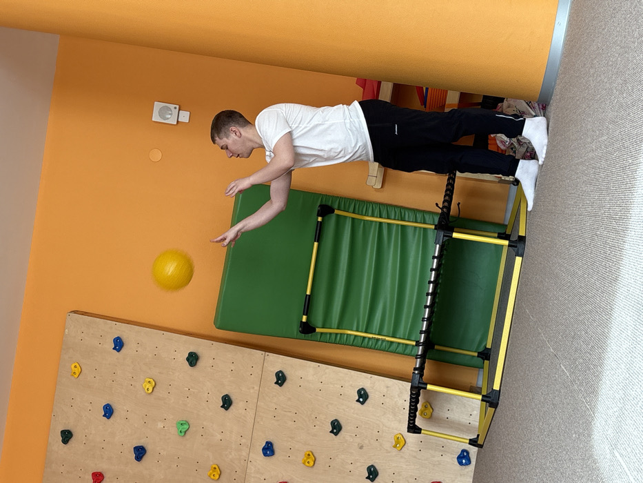The scene is an indoor rehabilitation or gymnasium facility in Izhevsk, Russia