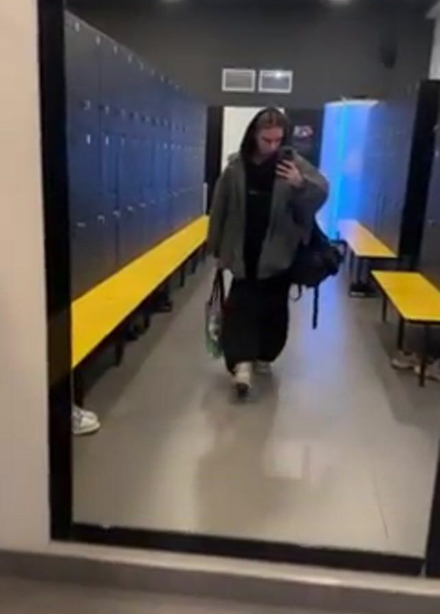 A woman stands in front of a mirror in a locker room, holding a phone in her right hand and a tote bag in her left. She is wearing a black hoodie, a gray jacket, loose black pants, and off-white sneakers. A black duffel bag hangs from her shoulder. The locker room has rows of blue lockers on either side with yellow benches in front of them. The floor is gray tile, and the lighting is bright. She is taking a selfie.