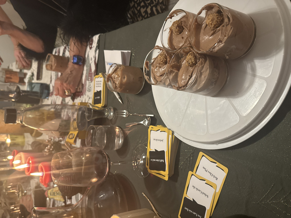 A table setting featuring glasses of chocolate dessert on a white tray. Several wine glasses and a water bottle are also on the table, along with game cards displaying German text. A person's hand is visible with an Apple watch. The scene is lit by candles, creating a warm and inviting ambiance.